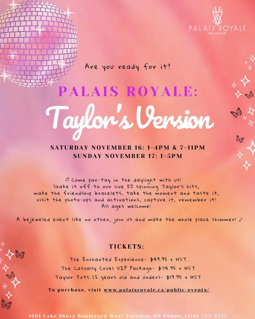 Palais Royale将举办为期两天的活动,盛大的派对在Ballroom举办,让所有年龄的Taylor Swift粉丝和乐迷,都可以享受派对。在音乐、美食、及周边商品的包围下,和同好交流,一起享受美好的夜晚。