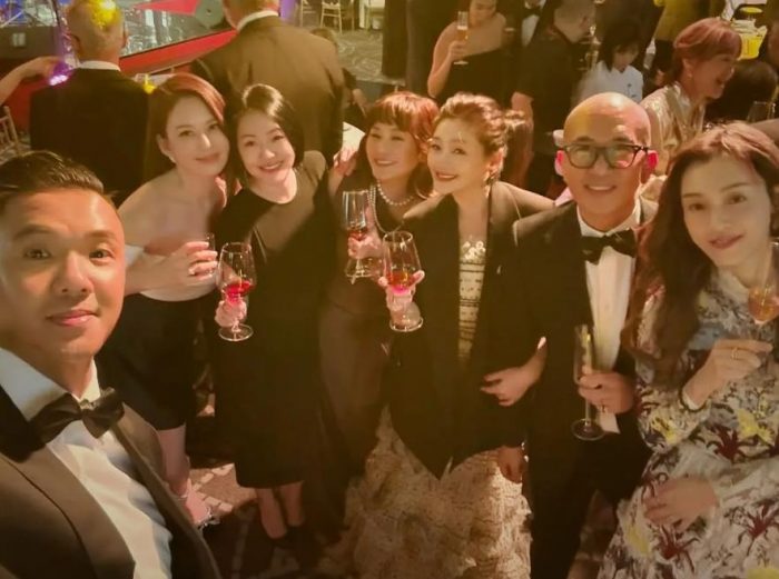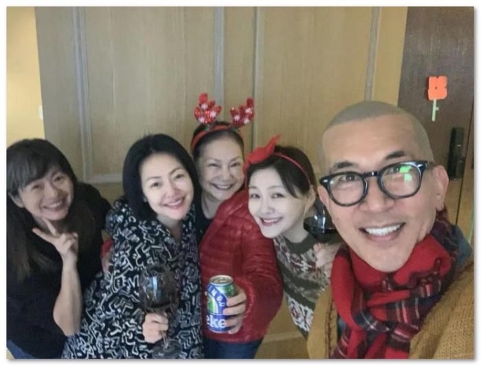 大S(右三)在1月25日才现身王伟忠女儿婚宴,大伙开心合影留念,