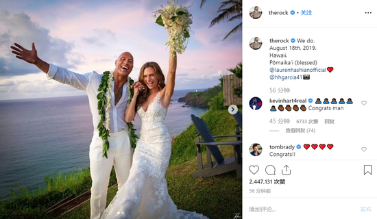 照片中,巨石强森身穿全白西装,女友则是身穿典雅纯白长婚纱,两人露出大大微笑,双手紧牵,看起来非常幸福。他配图PO文写道:“我们愿意。”并标注日期和地点“2019年8月18日,夏威夷”,两人交往长达12年,终于正式成为夫妻,不少名人好友都纷纷献上祝福。(网易娱乐)