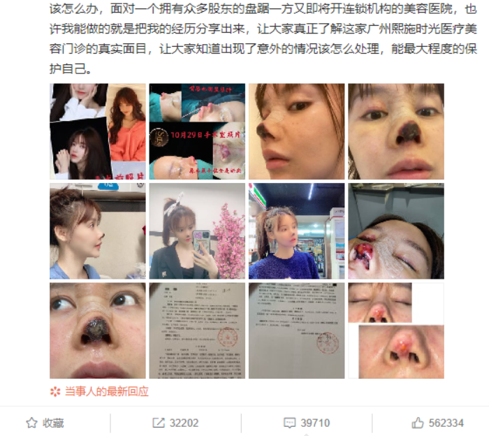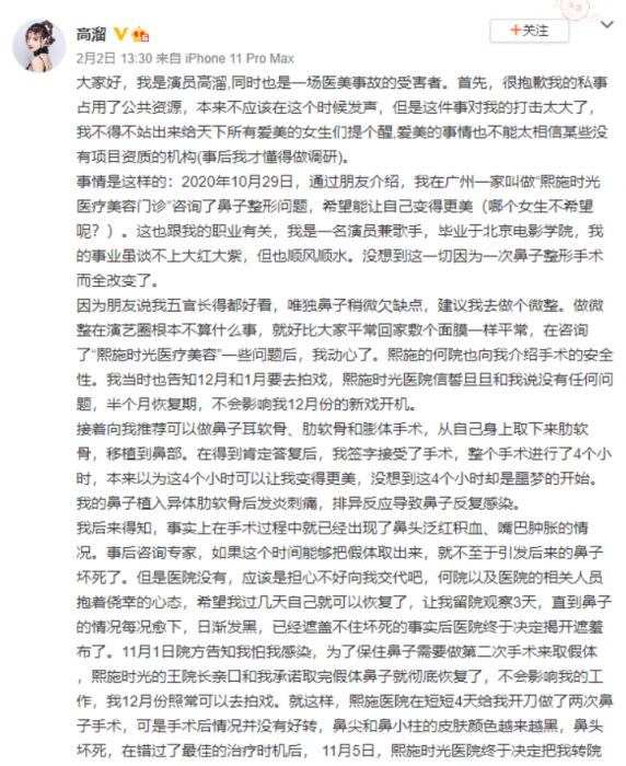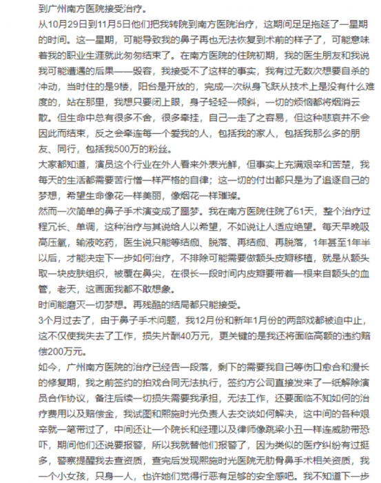 高溜文章中称,自己是去年10月29日经朋友介绍在一家广州整形医院——熙施时光医疗美容门诊做了鼻子整形手术,该医院当时表示术后半个月可恢复,然而实际情况是术后鼻头坏死,最坏可能毁容。这期间她无法履行拍戏合同还面临200万违约金赔偿,期间更是数次想要自杀。而该广州医院态度恶劣,对其进行威胁恐吓,高溜因此报警。经警方提醒,高溜发现该医院无相关手术资质。