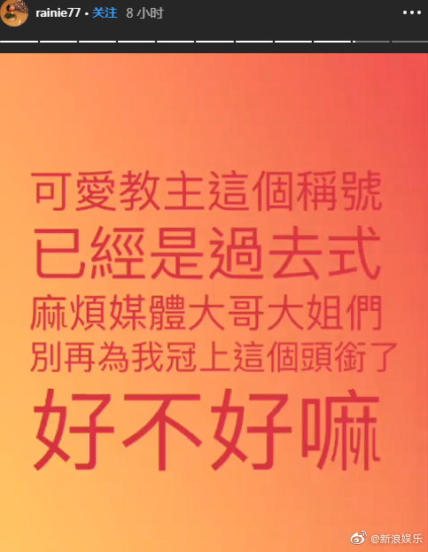 昨晚,楊丞琳在社交平台发文称,可爱教主这个称号已经是过去式了,“麻烦媒体大哥大姐们,别再为我冠上这个头衔了,好不好嘛”。