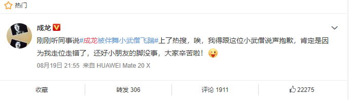 8月19日晚,成龙发文回应被伴舞小武僧飞踹一事,称:“刚刚听同事说#成龙被伴舞武僧飞踹#上了热搜,唉,我得跟这位小武僧说声抱歉,肯定是因为我走位走错了,还好小朋友的脚没事,大家辛苦啦!”