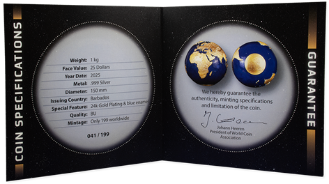 网站上描述指,“这枚令人惊叹的银币精心描绘了这个星球的美丽:地球,从广阔的水体到细致的山脉,每一个特征都展示了定义这一非凡收藏品的艺术性和精确性。