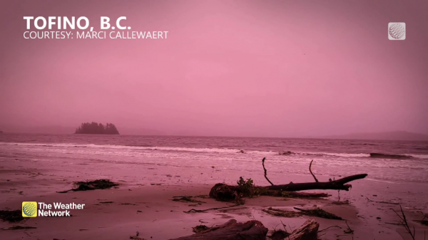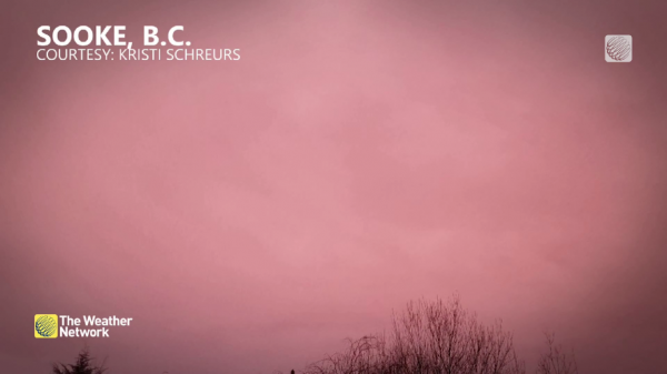 被目击者形容为“超诡异”的鲜艳粉红色光芒照亮了温岛整个地区,从Sooke到Lake Cowichan,从Campbell River到Tofino,还有Courtenay,有很多人都停下步来,为这迷人的一幕惊叹,不可错过打卡机会,有些人甚至描述天空染上了一层淡黄色。