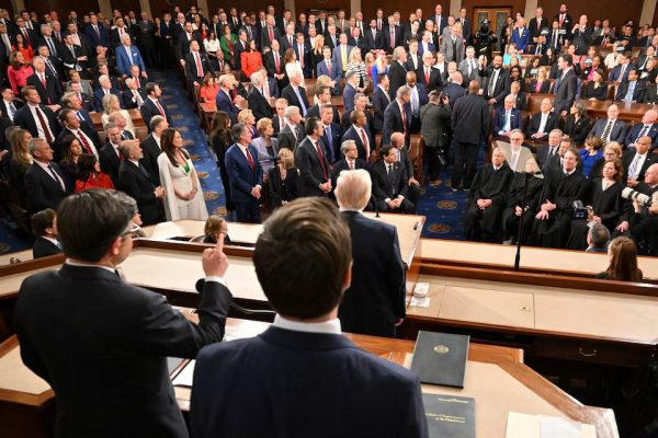 然而共和党议员曾多次起立欢呼和鼓掌,包括在他谈及关税政策的时候。