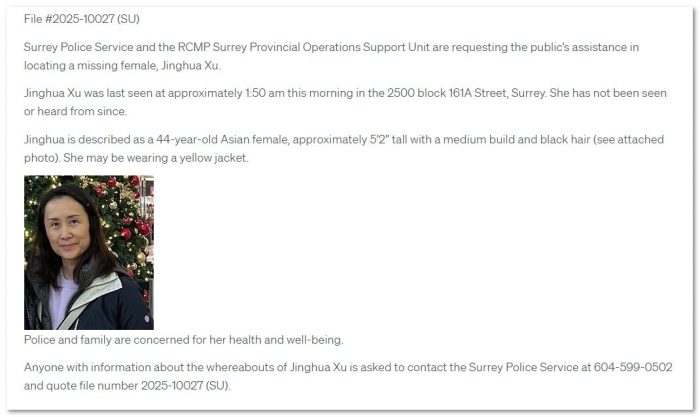 【星岛都市网】BC省素里警方发布公告,素里警察局和皇家骑警素里省级行动支援组正寻求公众协助,寻找一名失踪的华人女子徐静华(Jinghua Xu 音译)。