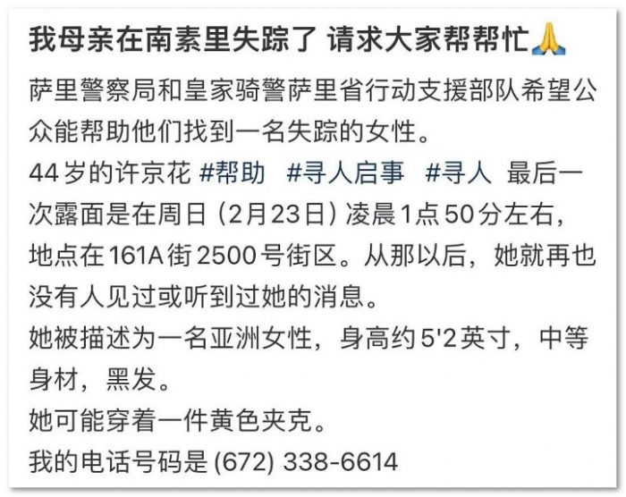 小红书上有疑似徐女士的孩子发出的帖子,也爆出更多失踪细节:徐女士是凌晨突然出门,出门没有带手机钱包,没有留下任何字条解释。车子在Crescent Beach找到(目前已被拖走)。