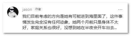 昨晚23点36分,徐女士的孩子再次发帖,称妈妈还没有找到,希望网友帮助转发微信群寻人。而今天凌晨一点设置的置顶评论中Jason写道:我们目前考虑的方向是她有可能进到海里面了,这件事情发生完全没有任何迹象,她两个月前只是身体不太好,家庭关系也很好,没想到她在半夜会开车出去…