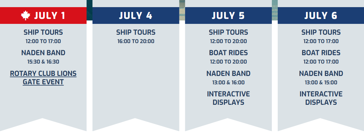 從周二國慶日起,護衛艦「利齋拿號」(HMCS Regina) 將在布勒內灣 (Burrard Inlet) 開放讓民眾參觀,海軍並將提供試乘硬身充氣艇的機會。這兩項活動將於7月1、4、5及6日(周二、周五、周六和周日) 進行。