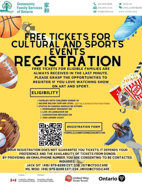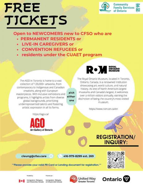 【星岛综合报道】社区服务机构家和(CFSO)将会向合资格人士免费派发安大略省美术馆(AGO)或皇家安大略博物馆(ROM)门票。除免费门票外,家和亦会举办一系列活动,涵盖就业服务、新移民安居服务、入籍服务等范畴,有兴趣参加的人士可以到家和网站报名。