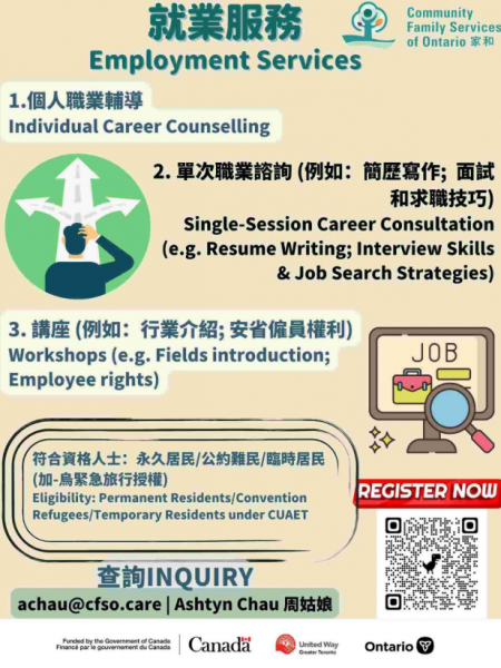 家和提供恒常就业服务,包括个人职业辅导、简历写作与面试技巧等单次职业咨询和行业介绍与雇员权利等讲座。有兴趣人士可以到家和网页查询。
