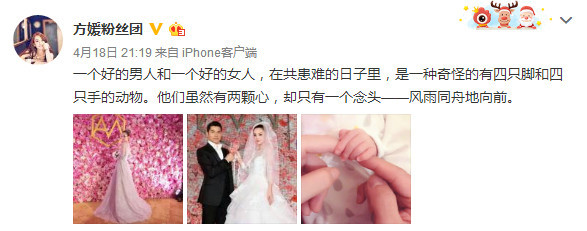 近日,郭富城与方媛结婚一周年纪念日,方媛粉丝团在微博晒出郭富城夫妇的结婚照,并引用毕淑敏的话为她们送上祝福:“一个好的男人和一个好的女人,在共患难的日子里,是一种奇怪的有四只脚和四只手的动物。他们虽然有两颗心,却只有一个念头——风雨同舟地向前。”
