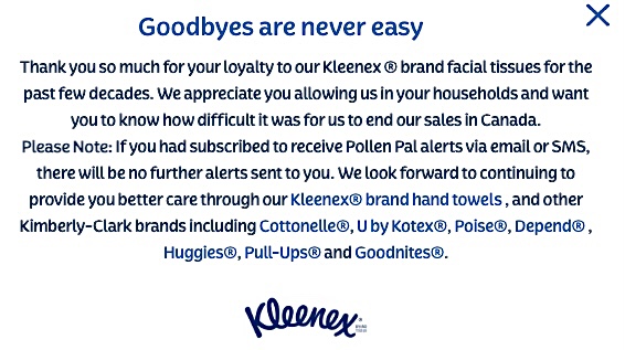 “非常感谢你们在过去几十年对 Kleenex 品牌面巾纸的忠诚。我们感谢你们允许我们进入您的家庭,并想让你们知道结束在加拿大的销售对我们来说是多么困难,”该公司写道。