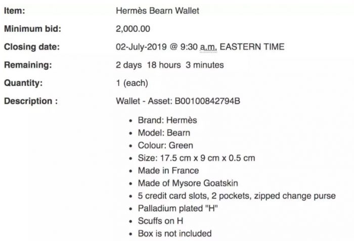 這款愛馬仕Hermès Bearn小羊皮錢包,零售價約為$3475左右,在GCSurplus起拍價為$2000。