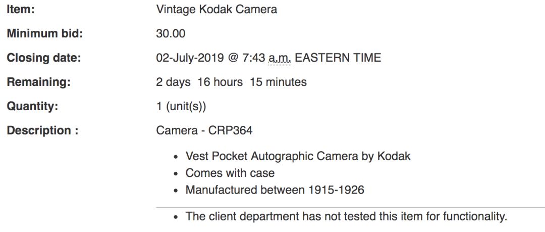 如果你愛好收藏復古的東西,也可以去逛逛。下面這款約1915年至1926年的老式柯達相機,只要$30起拍!