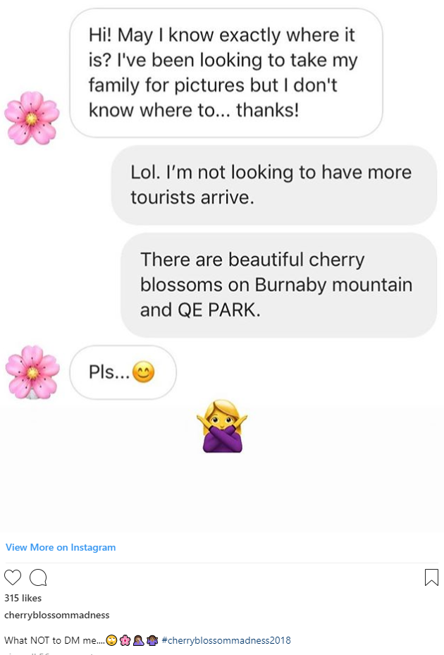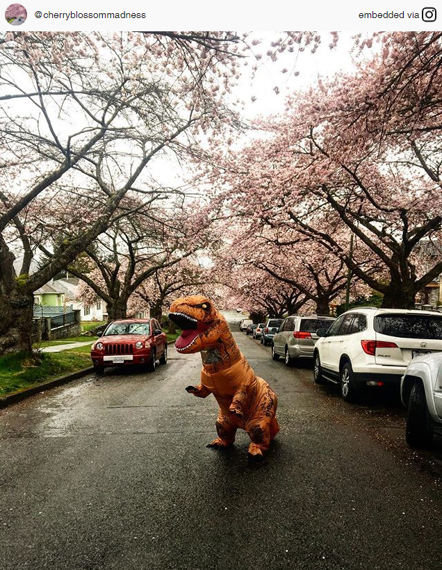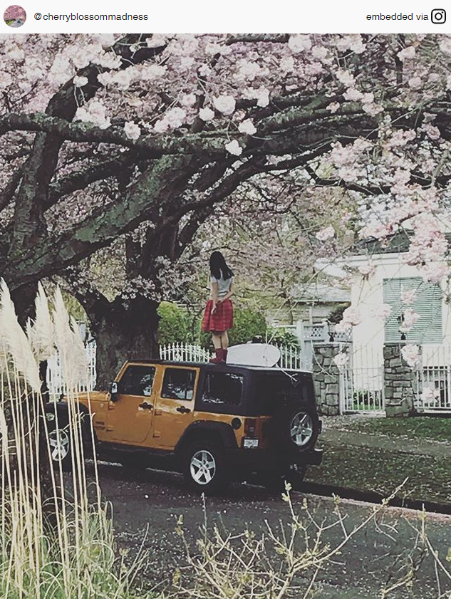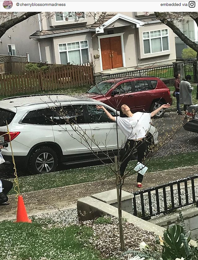 Lele Chan是温哥华的书法设计师,她所居住的这片区域盛开着如火如荼的樱花。从2013年开始,Lele Chan就开始用#cherryblossommadness(樱花狂热)的话题标签记录每年在她家附近拍照的游客们。2016年,她决定专门开一个Instagram账号,用来记录游客们五花八门的拍照姿势。