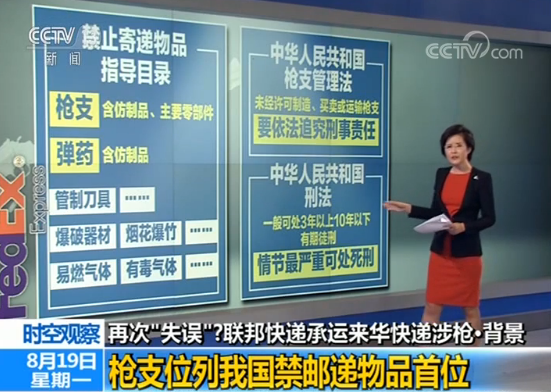 中国对枪支一直有着非常严格的管控,在国家邮政局《禁止寄递物品指导目录》里,十余类禁止邮递物品中,“枪支(含仿制品、主要零部件)弹药”是排在首位的。根据《中华人民共和国枪支管理法》,未经许可制造、买卖或者运输枪支的,要依法追究刑事责任。在中国邮寄武器已经属于刑事案件,根据中国刑法,一般可处3年以上10年以下有期徒刑,情节最严重的可处死刑。联邦快递在国内承运时如明知故犯,后果无疑很严重。