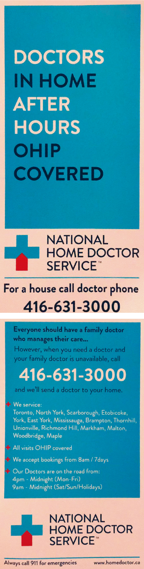 日前士嘉堡有condo居民收到一份宣传册子,指在非上班时间、周末、假日或家庭医生不能出诊时,打电话使用该公司的服务,就有医生上门家访诊症(after-hours home visit family doctor),并且安省OHIP全覆蓋,没有任何额外费用。