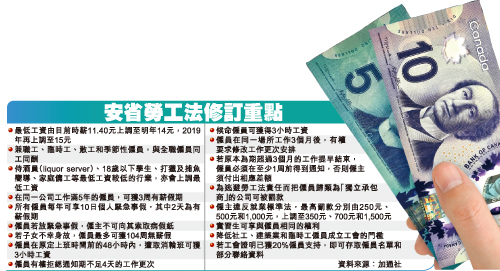 她说,目前全省有10%工人领取11.4元最低时薪,30%工人时薪低于15元。由明年1月1日起,安省最低时薪增至14元,2019年1月1日再提高至15元,其后将按通胀率调整。