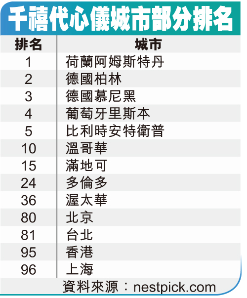 专门经营欧洲租盘的网上平台Netspick,根据16个标准,包括就业、旅游、住屋、交通,以至互联网速度等类别,为全球城市评分,以10分为满分,计算各城市得分后排列出总排名。