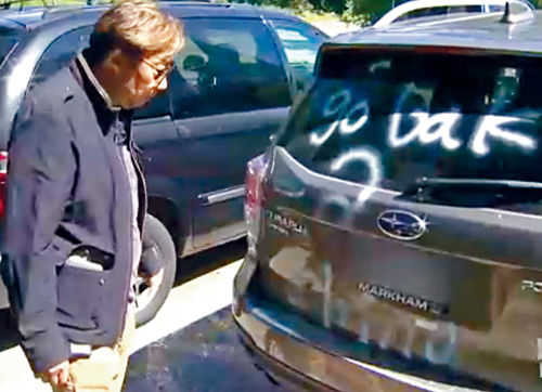 移居多伦多逾35年的华裔男子,周一早上发现停泊在居所柏文停车场的汽车遭破坏,两盏车头灯损毁,车身更被喷上「滚回中国」的字眼。多市警方指事件可能涉及仇恨犯罪,事主则称感「震惊」和「受伤」,认为所有种族都应受到尊重,不应存在种族歧视。据Global News报道,姓高(Wiley Ko,音译)的男事主居住位于市北Don Mills Road夹401公路邻近的一个柏文单位,他在刚过去的周日下午5时左右,把汽车停泊到柏文大厦的停车场。他的儿子翌日回家时,发觉父亲的汽车被喷上白漆,内容包括辱骂华人的英文字句「滚回中国」(Go Bak to China)、辱华字眼「chink」及图像,车头灯亦碎裂。