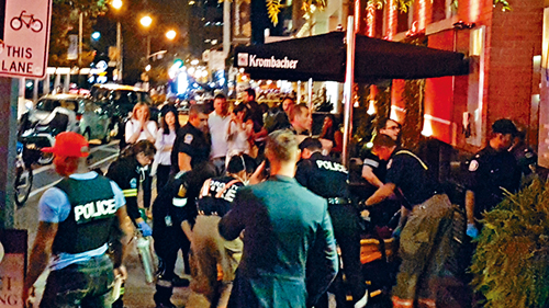 案发于市中心闪高街(Simcoe Street)夹阿德莱德街(Adelaide Street)地区的扒房Michael’s On Simcoe,警方昨晚9时左右抵达现场,发现一名男子在餐厅内中枪倒卧地上,没有生命迹象,救援人员在餐厅外其后为伤者进行心肺复苏急救,然后将伤者送往医院创伤中心抢救。