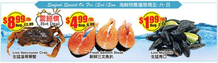 海鲜周末特价,温蟹$8.99/LB,三文鱼扒$4.99/LB。