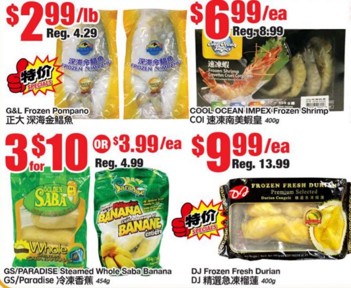 深海金鲳鱼特价$2.99/LB。急冻榴莲特价$9.99/盒。
