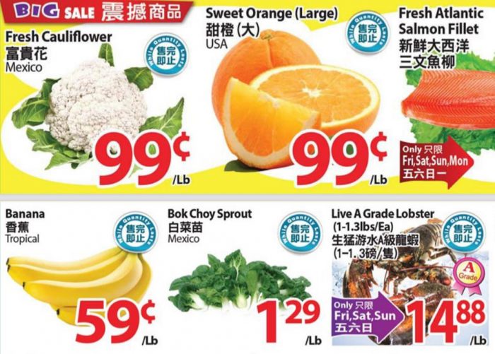 香蕉特价$0.59/LB。A级大龙虾特价$14.88/LB。
