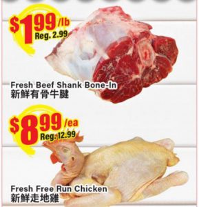 新鲜有骨牛腱特价$1.99/LB;新鲜走地鸡特价$8.99/只。