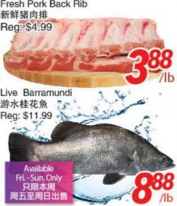 新鲜猪肋排特价$3.88/LB;游水桂花鱼特价$8.88/LB。