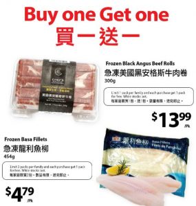 买一送一(5月14日~16日),安格斯牛肉卷$13.99/盒,龙利鱼柳$4.79/包。