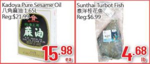 八角麻油1.65L特价$15.98;冰冻桂花鱼特价$4.68/LB。