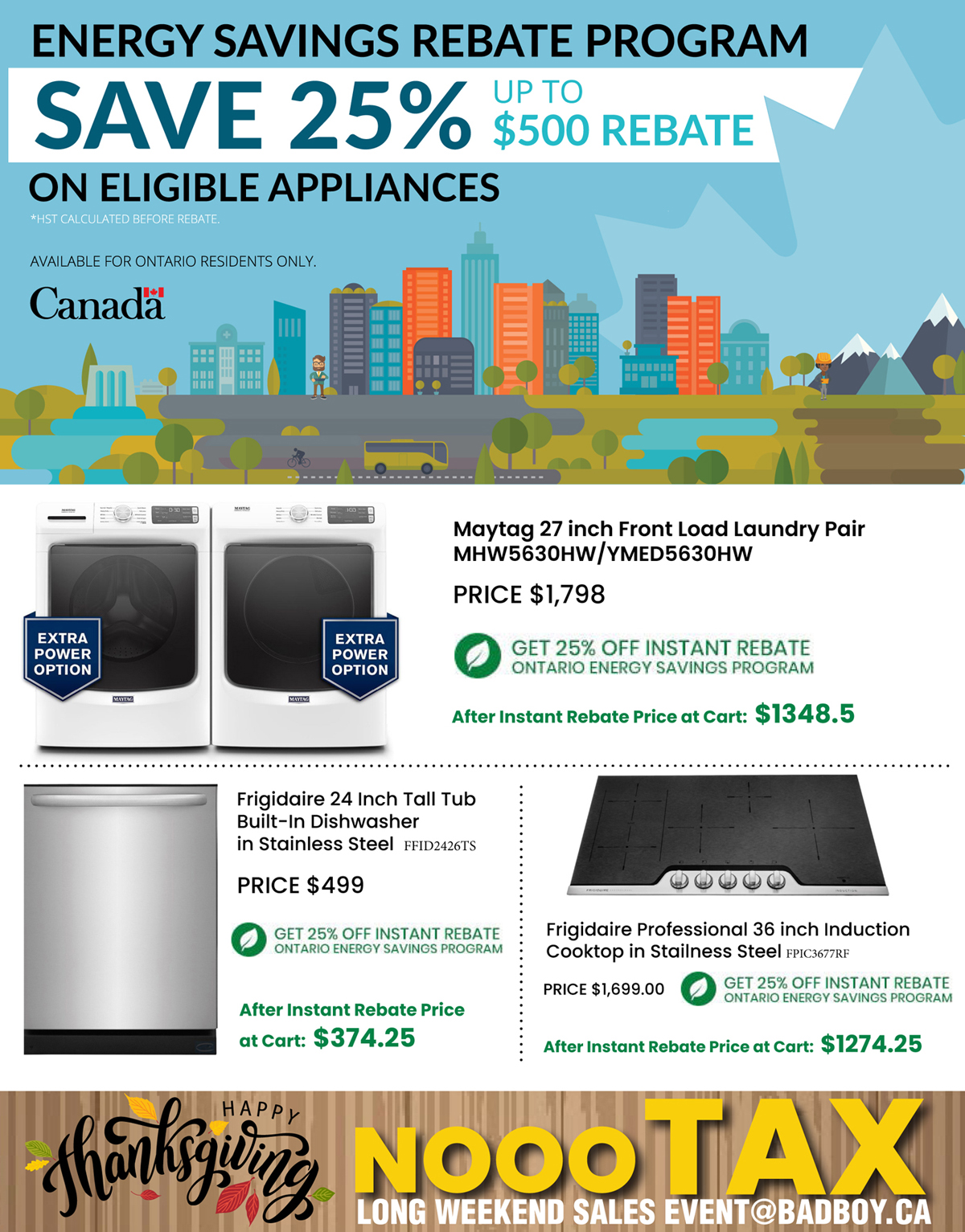 2. 指定节能型号大型家电 (GE, Samsung, Bosch, KitchenAid, Whirlpool, Maytag, Frigidaire 等) 可享25% 或高达$500即时回扣