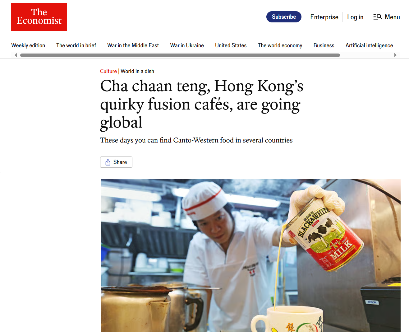 英国《经济学人》(The Economist)上月刊出题为〈茶餐厅,香港奇特的fusion咖啡室,正在迈向全球化〉(Cha chaan teng, Hong Kong’s quirky fusion cafés, are going global) 的专文,剖析这个新趋势。