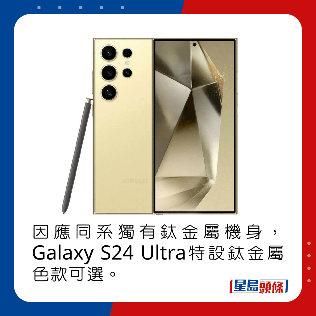 来到最多Fans关心的Galaxy S24 Ultra,综合目前的传闻爆料,新作有3个重大改动,先是沿用多年了的曲面荧幕设计,将改回更适合S Pen手写的平面荧幕,峰值亮度进一步提升至2,600nits。另外,Galaxy S24 Ultra边框首次改用钛金属物料,除了加强机身硬净程度,另一原因当然是要跟iPhone 15 Pro系列抗衡。最后一个改动,是新作长焦段远摄镜的光学变焦,由上代10×换成5×,虽然可以令变焦更连贯,但对喜爱追星、睇演唱会的Fans来说,可能要出动由AI加持的10倍数码变焦。