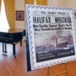 新省省督拿勃朗(Arthur J. LeBlanc)昨日主持邮票公布典礼,邮票图案显示法国军火船“勃朗峰号”(Mont Blanc)与在挪威注册的比利时救援船,1917年12月6日在哈利法斯港口相撞后的情况,上面则有当年报章的标题“哈利法斯被摧毁”。