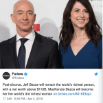 据报道,他俩签订了史上最昂贵的一份离婚协议;这场离婚直接让麦肯齐一跃成为全球第三富裕的女性。