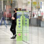英格兰过去一星期新增逾3.3万人感染Delta变种病毒,为此,当局延迟解封,图为一名戴口罩的男子站在公交站附近的Covid-19信息标志旁。法新社