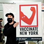 在纽约哈林区,一名工作人员在疫苗接种点外举著提示牌。法新社