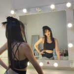照片中她站在化妆镜前,背对镜头,构图新颖。她半扎高马尾搭配性感红唇,将卫衣系在黑色背心套装外,腹肌隐约可见。