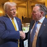 勒格特周六在社交网路 X 上发布了一张自己与特朗普握手的照片,他说:“与美国当选总统特朗普讨论加拿大边境管制和对加拿大产品的关税。”