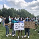 大批学生今天中午走出教室,聚集在校园内,抗议校方对校内长期以来一直存在的性别歧视视而不见。