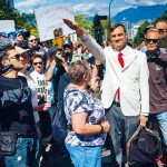 张誉摄有反歧视者在宠物狗身上挂上「我咬法西斯」标语。路透社约4000名反种族歧视人士昨日在温市府大楼外集会。CBC本报记者张誉 近4,000名反种族歧视人士周六在温哥华市府大楼外集会,目的本来是与声称同日同地举行的「加拿大白人至上主义」集会打对台,惟白人至上主义集会仅有零星数人到场。双方昨日发生争论及激烈口角,又升级至相互推撞,但没有演变为大规模冲突及暴力事件。大批警员在场戒备并将冲突双方分开,最后警方以妨碍治安罪名拘捕5人。有涉嫌种族歧视的白人,更被逾1,000名反歧视市民追骂一条街,最后要由警方护送离开。美国维州本月13日发生「白人至上」主义引发的集会冲突事件,白人至上主义者与反极右人士在街头对峙,口角升级为暴力冲突,造成1死34伤。事后世界反伊斯兰联盟(Worldwide Coalition Against Islam)与极右组织表示,计划19日在温市府门外举行「加拿大白人至上主义」集会,抗议加国多元文化、移民和难民政策,一度有逾1,000人表示参加。同日反种族主义组织也发动民众在相同地点集会。 反移民男子标语被撕破 温市府保安人员与温市警周六早上严阵以待,市府大楼各出口均被警车挡住,禁止车辆进入。上午10时半左右,反种族歧视人士陆续到场,仅1小时后,市府南侧入口就被举着标语的抗议者挤得水泄不通。温市警方为此一度封锁育空街(Yukon St.)夹西10街(W. 10th Ave.)路口附近路段。反种族歧视者集会中午12时45分正式开始,在发起人的带动下,近4,000人在现场齐齐高呼「不要仇恨、不要恐惧、不欢迎纳粹(No hate, no fear, Nazis are not welcome here)」的口号。其间有白人男子高举「加拿大阻止非法入境者」标语,同时大喊:「我不要引起战争,而是反对所有非法入境者。你们有发言权,我也有表达的权利。」现场随即发生争吵,该男子的标语也被撕破。有反对者与男子发生肢体冲突,警方马上介入将该男子带走。另一涉嫌种族歧视的白人男子,与反种族歧视者发生推撞,一度把对方推倒在地,随即引发众怒。市警用单车将人群挤开,并要求该男子尽快离开现场。岂料约1,000名抗议者一路追逐该男子,从西11街(W. 11th Ave.)追至西10街,同时高呼要对方赶紧「滚蛋」,但该男子依然不断抨击杜鲁多(Justin Trudeau)的开放难民及移民政策。原拟成群现身的世界反伊斯兰联盟和极右组织成员,未有按原计划在周六下午2时聚集在温市府北侧与反种族歧视人士打对台,仅有零星数人前来「打游击战」,结果成为众人眼中的「过街老鼠」。温哥华市长罗品信(Gregor Robertson)、卑诗卫生厅长狄德安(Adrian Dix)、列治文议员区则光等政界人士,周六到场支持反种族歧视。罗品信强调,温哥华是充满爱和尊重的城市,对世界各国人民和各族裔敞开怀抱,因此大家需要团结一致,共同支持城市发展。多个团体代表也有到场,呼吁大家理智发声,不要造成任何暴力流血事件。集会活动从上午持续至下午5时半左右结束。温市警在今次事件中共拘捕5人,他们涉嫌妨碍治安。另外,有2人被警方劝离现场以防止动乱。警方表示,未有接到任何涉及受伤和遭袭击的报案。