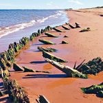 没人知道在爱德华王子岛海滩上发现的,到底是一条船或一个码头残骸。 CBC电视图片本报讯 海边的人对潮水送上岸的各种物品习以为常,但是家住爱德华王子岛(P.E.I.)艾伯顿的艾伦.麦克劳德(Ellen MacLeod)几天前却在海滩上发现了一些令她迷惑的木桩。它们不像是平常顺水漂来的浮木,倒像是从沙里冒出来的,表面还长了青苔。加拿大广播公司(CBC)记者报道,麦克劳德并不是唯一发现这种奇怪木桩的P.E.I.岛民,但是到目前为止,没有人知道它们到底是一条船或一个码头残骸。它们在涨潮时会被淹没,退潮时才看得见。麦克劳德的好奇心被挑了起来。她第二天又和女儿及朋友回到海滩上,还带了一把铲子。她们发现了一段很像是船壳板的木板,一半露在外面。如果真的是一条船,它从何处来?承载着甚么秘密呢?麦克劳德联系了当地的博物馆以及几位历史学家,希望有一天能够找到答案。资料来源:加拿大国际广播电台(RCI)