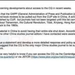 网上图片据巴士的报报道,英国剑桥大学出版社日前怀疑被中国国家广电总局要求,把旗下的国际权威期刊《中国季刊》(The China Quarterly)内300多篇,内容涉及天安门事件、文化大革命、西藏、台湾等论文移除,否则网站会被中国封锁。剑桥大学出版社昨天声明证实,已从网站移除相关文章。在过去的星期四,网路流传一封来自称来自《中国季刊》的主编普林格尔(Tim Pringle)的邮件,称中国广电总局要求剑桥大学出版社的中国网站撤下300多篇文章,当中涉及天安门、文革、西藏、新疆、香港及台湾等敏感议题。需删除的文章出版日期涵盖近数月至1960年代。普林格尔又指,暂时只有《中国季刊》被封,但估计同一学术圈的其他期刊,迟早也会面临封杀。剑桥大学出版社的声明中指,接受要求移除文章,是为了确保在这个市场内的研究人员及教育界人士,能使用我们出版的其他学术及教育材料。剑桥大学出版社现在、将来都不会主动审查内容,只有当被要求时,才会考虑撤下个别文章。出版社下星期,会在北京书展与相关机构沟通。剑桥大学出版社隶属于英国剑桥大学,1534年成立,是现存最古老的大学出版社之一。就在网络流传《中国季刊》主编的邮件当日,美国宾夕凡尼亚大学安南堡传播学院及社会学系副教授杨国斌在微博上指,自己收到主编通知,所述与网路疯传的邮件相符,感叹:「当代中国研究最重要的国际刊物,受到如此限制,情何以堪!闻所未闻啊。国内不是在推进当代中国研究吗?怎么推进?」有内地网友指,以后国外更多的中国研究期刊,凡是与大陆有商业往来的,都会「在中国审查面前脆弱不堪」。C04