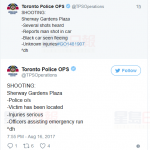 推特截图据CBC报道,密市商场发生枪击案,两人在停车场中枪伤,一人伤势危殆。多伦多警方称他们在7:30收到电话,称Sherway Gardens发生枪击案,两人在咖啡店附近的停车场受伤,一名男子受致命枪伤,另一人受非致命枪伤。到截稿前,暂时未知他们的年龄和身份,警方发推称有两名男子疑犯开着黑色SUV逃离现场。C04