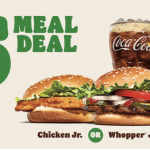 这次$5 Meal Deal组合可选Whopper Jr.或Chicken Jr.汉堡包,搭配小份薯条和小杯饮品,让你能够用最低价格满足饥饿感。