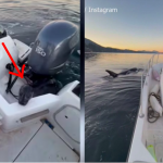 3头鲸鱼和那只海豹在船周围游了大约30秒,之后海豹似乎看到了一线生机,只见牠跃出水面,再跳到他们船上的引擎室,摆脱了危险。