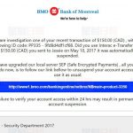图片为诈骗方假冒银行发出的邮件诈骗手法又一桩,假冒银行发出邮件。根据收到邮件的民众表示,他收到一封假扮BMO银行发出的邮件,说明他的一笔转帐失败导致于他的帐户遭到冻结,要求根据信中的网址解除帐户的封锁。根据链结的点击,发现此封信明显为诈骗的手段,要求收信人提供关于银行帐户的信息,民众收到类似邮件请务必提高警觉,不要随便将自己银行信息透漏,必要的时候可以致电银行做确认以免上当。